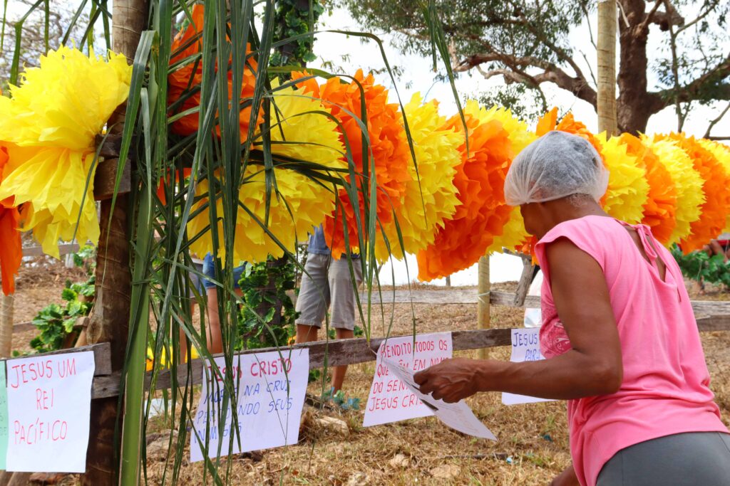 Helena Aparecida Simões Silva auxilia na ornamentação todos os anos, disse: “Estou dando o melhor para que tudo ocorra bem e fique bem bonito. Olha quantas pessoas vieram para ajudar a enfeitar! A festa, sem dúvidas, é uma partilha!”