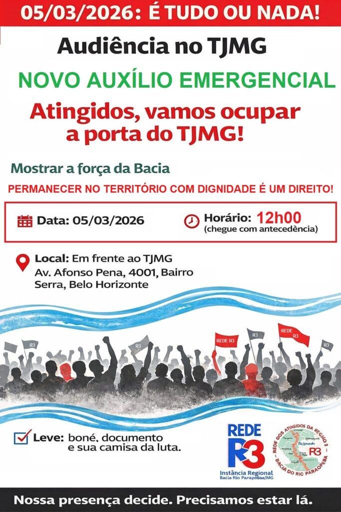 Amanhã, dia 05/03, será julgado recurso apresentado pela Vale, em abril de 2025, no processo que trata do Novo Auxílio Emergencial (NAE). O recurso, chamado de Agravo de Instrumento, questiona decisão da primeira instância sobre a continuidade do benefício. Pessoas atingidas de toda a bacia do Paraopeba devem ser reunir à porta do Tribunal de Justiça de Minas Gerais (TJMG), onde ocorrerá o julgamento.
