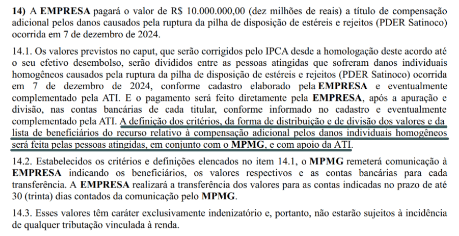 A cláusula prevê a participação das pessoas atingidas na definição dos critérios e forma de distribuição dos valores. No relatório, a ATI pontua a importância dessa participação nas tomadas de decisão do processo de reparação, para a construção de critérios mais justos e adequados às questões territoriais, sociais e econômicas da comunidade. Conforme consta no documento, o protagonismo da pessoa atingida foi um dos princípios que orientou o trabalho do Nacab.